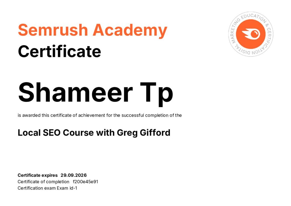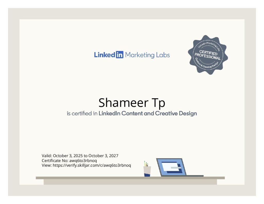 Hi, I’m shameer tp, Google certified and leading digital marketing expert in Calicut, Kerala. I help companies and brands grow by creating powerful online marketing strategies that run real, measurable results. As a freelance digital marketer and a digital marketing strategist in Calicut, I work closely with brands to create tailor -made marketing solutions that increase visibility, attract the right audience and strengthen their online presence. My focus is to combine creativity, data and emotional compounds to produce effective results that run continuous business growth.